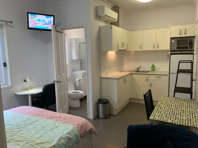 配有微波炉/烤箱,冰箱,橱柜。 hot plate, toaster, kettle.和基本的餐煮器具。书桌椅和很多电源插孔。内嵌衣橱,双人床有四个大储物柜.餐桌椅,还有沙发椅。电视,空调,电扇。