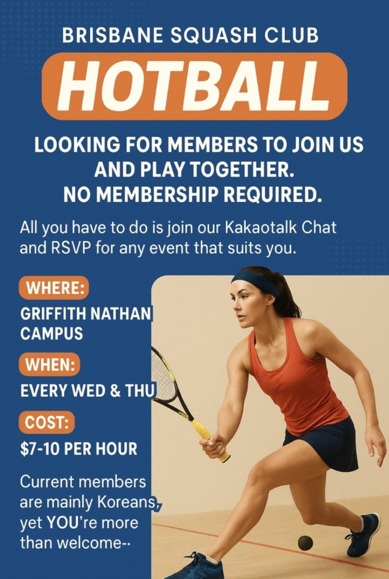 브리즈번 남쪽 Griffith Nathan Campus에 있는 스쿼시 코트에서 매주 수,목 6~8시 & 주말에 모여 같이 운동하고있는 브리즈번 최대규모 스쿼시 클럽입니다. 저희 클럽과 함께하실분들을 찾고있어요.