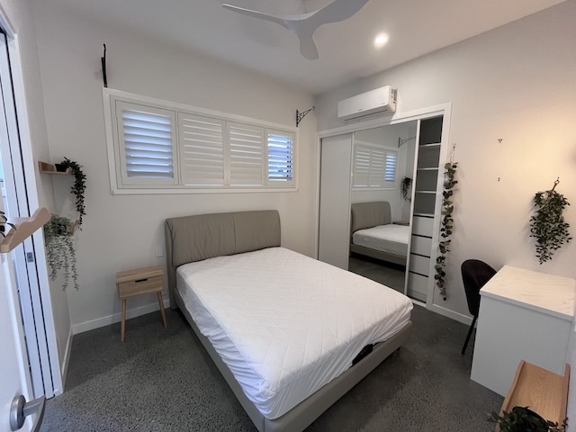 One bed room with airy security screened windows: big wardrob with mirror/sliding door, queen bed (stable frame and comfy matress, DeRucci), custom-made desk. Air conditioning.