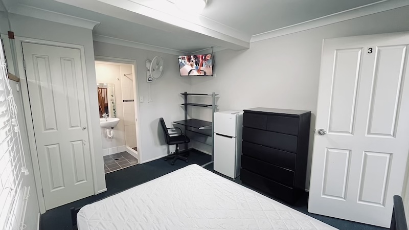 Ensuite Room with own bathroom, TV,air-con,fridge. double bed, drawers/bookcase, desk &chair. built-in. WiFi is available.