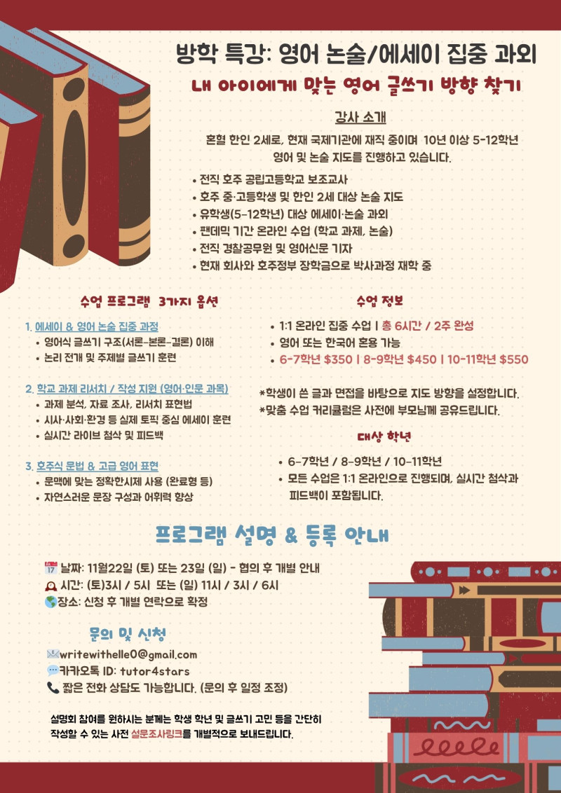 영어 논술은 항상 어린 학생들에게는 어려운 주제이지만 학기 중에는 너무 바빠서 주기적인 과외를 하기에 시간적으로 여유가 없는 학생들을 위해 방학 특강을 열게 되었습니다. 오프라인 설명회는 브리즈번에서 있을 예정입니다.