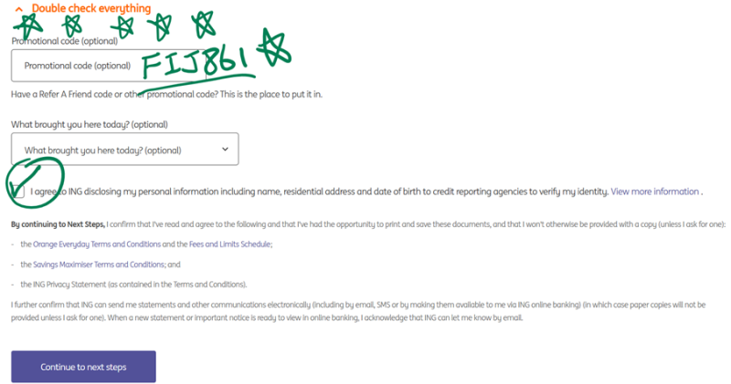 1          Open an Orange Everyday at campaigns.ing.com.au/refer?code=FIJ861&p=a enter the promo code you give them in the box at the end of the online form. ( 링크로 들어가서 Everyday account계좌를 오픈 하세요계좌를 만들때  프로모션 코드 “FIJ861” 기입합니다)