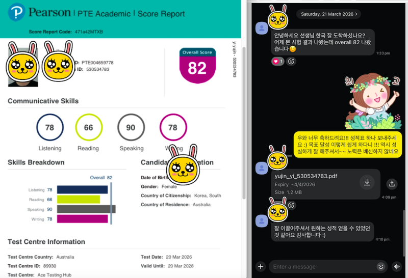 브리즈번에서 지역 이동 없이 16년 이상 IELTS, PTE 전문 지도 중입니다. 이젠 영어도 AI 컴퓨터 시험이 도입되어 시험 방식과 채점 제도가 매년 더 고도화되고 있습니다. 2026년 최신 업데이트 및 수정된 템플릿과 집중적인 실전 연습을 통하여 목표 점수에 가장 효율적으로 도달할 수 있게 도와드립니다. "전문가는 다릅니다." [최근 만점자 성적표 및 실제 피드백 확인: 위 관련 링크 참고]
