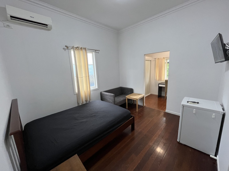 阳光明媚大房间+书房,配双人床,built-in衣橱,沙发椅和茶几, 书桌椅,书柜,冷暖空调,电扇,电视,冰箱。WiFi。