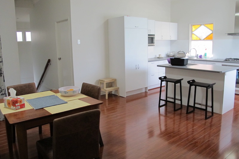 你们共用厨房、餐厅。厨房有两个水池,和太多的橱柜。反正到处都让你觉得宽松。
