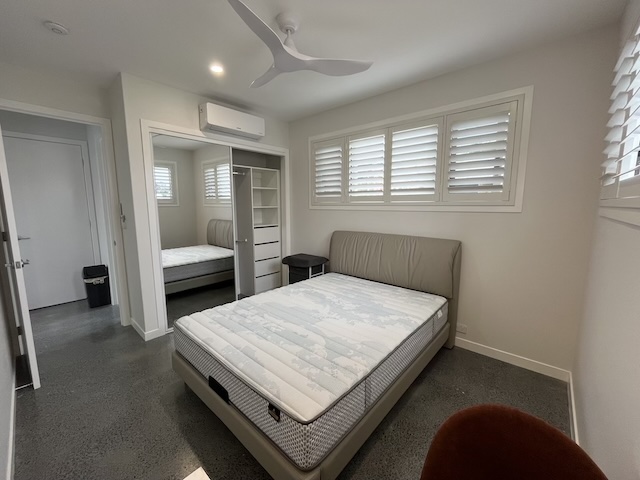 One bed room with airy security screened windows: big wardrob with mirror/sliding door, queen bed (stable frame and comfy matress, DeRucci), custom-made desk. Air conditioning.