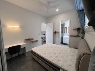 One bed room with airy security screened windows: big wardrob with mirror/sliding door, queen bed (stable frame and comfy matress,  DeRucci), custom-made desk. Air conditioning.
