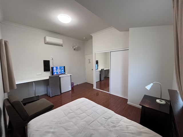 //big room with double bed,  built-in wardrobe, arm chair  & coffee table, drawers, desk and chair,TV Fridge,  A/C, Fan, WiFi.