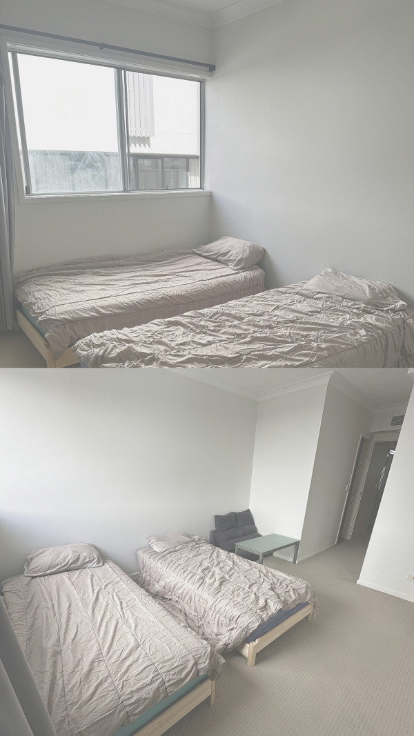 방엔 침대(두분일경우 싱글베드 두개 혹은 킹베드 가능)책상, 붙박이장, 수납장, 실링팬, 에어컨이 있습니다.
