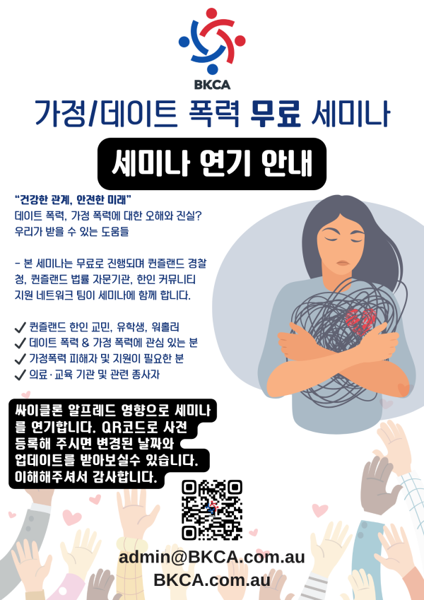 가정/데이트 폭력 무료 세미나 안내퀸즐랜드 한인 커뮤니티를 위한 DFV(가정·데이트 폭력) BKCA 세미나 ✔️ 폭력 예방 및 대처 방안 ✔️ 피해자 지원 서비스 & 법적 절차 안내✔️ 실제 사례 기반 대응 체계✔️ 익명 질문 및 사전 설문 참…