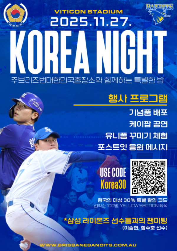 우리 브리즈번 출장소는 브리즈번 밴디츠 야구팀과 콜라보하여 Korea Night(야구 경기 행사)를 개최할 예정입니다. 평소 야구 관람을 즐기시는 분들께 좋은 기회이므로 관심있는 분들의 많은 참여 바랍니다. 1.…